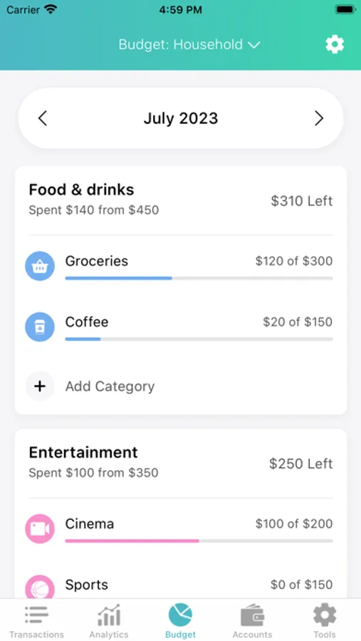 3. Budget Management: Create personalized budgets tailored to your lifestyle. Set limits for different spending categories and receive timely notifications when you approach your limits, helping you stay within your financial targets.
