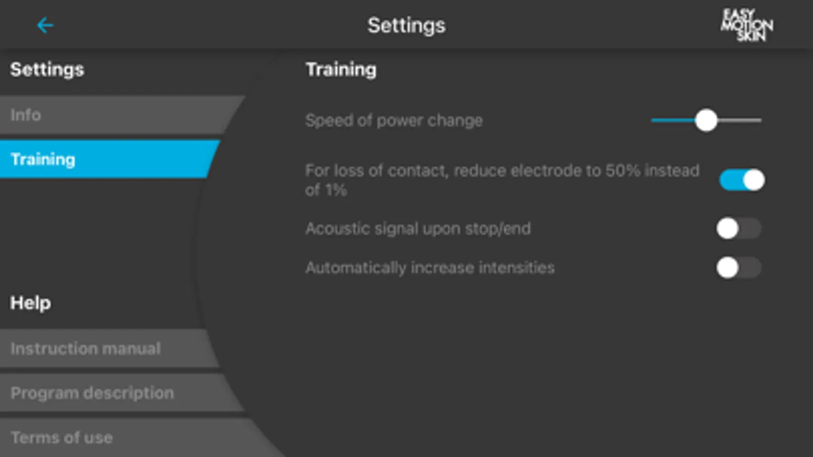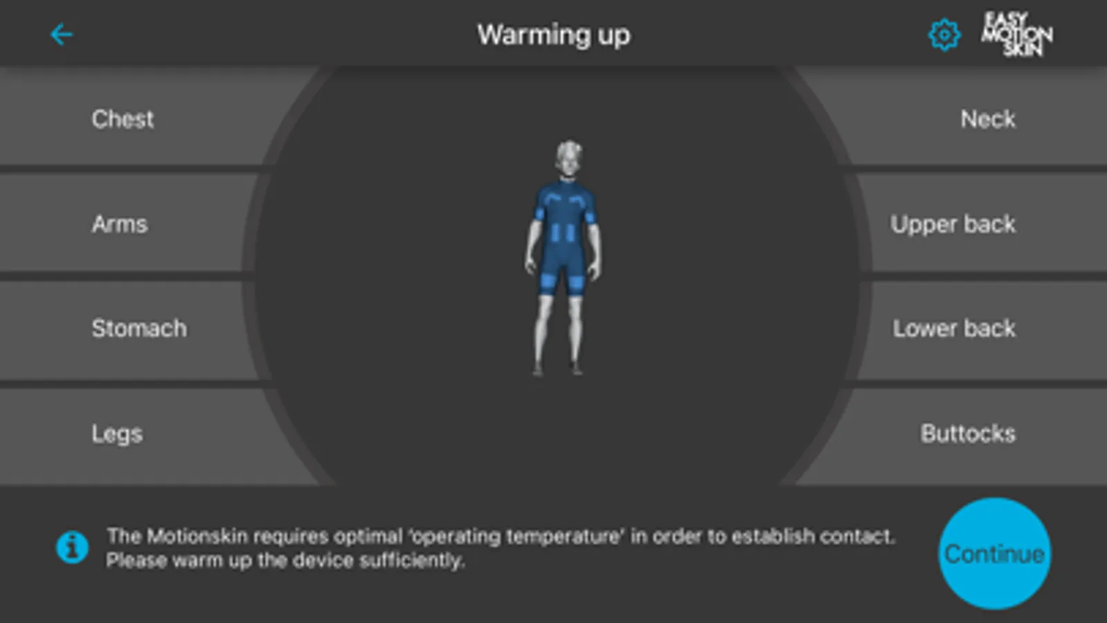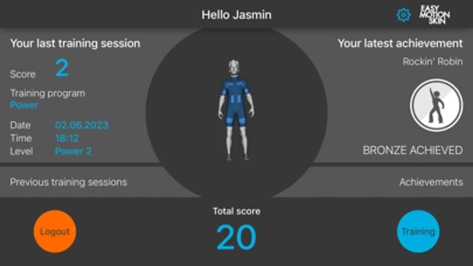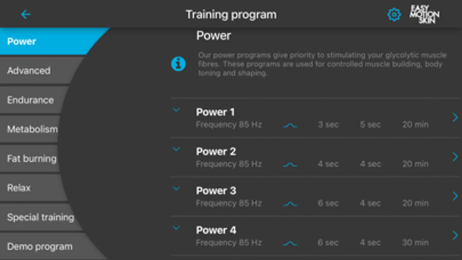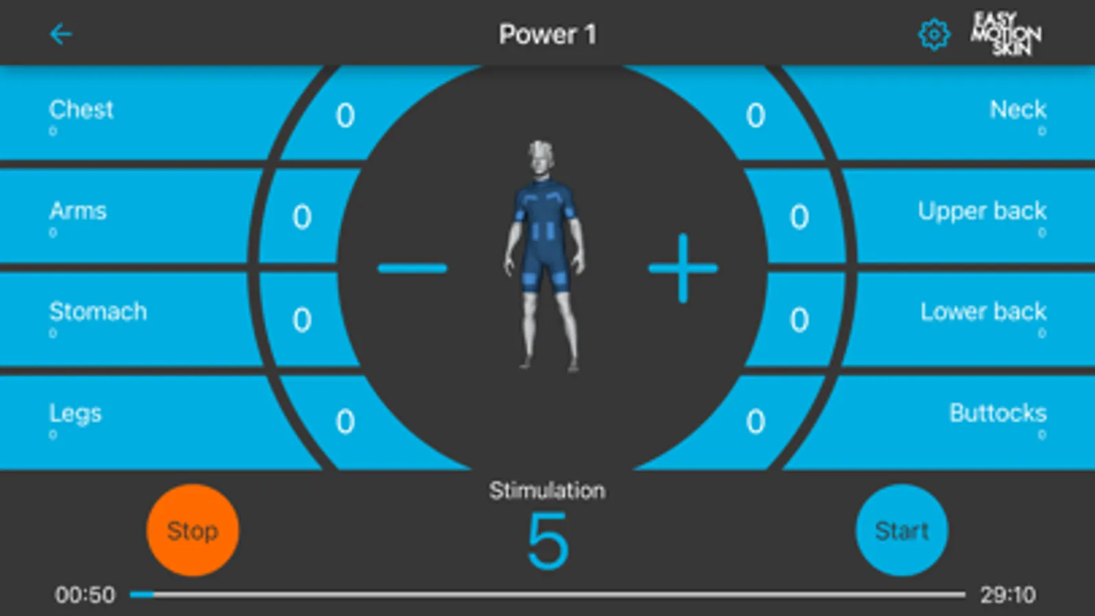 The EasyMotionSkin app is used both at home and in studio environments and allows you to control the MotionSkin. The app has various training programmes that can be performed with the EasyMotionSkin system. Strength training is offered in the 7 Hz frequency range, endurance training in the 40 Hz range, power training in the 85 Hz range and relaxation training at 100 Hz. The user receives an overview of their scores and has the ability to achieve different goals. The prerequisite for using the app is the availability of an EasyMotionSkin system.