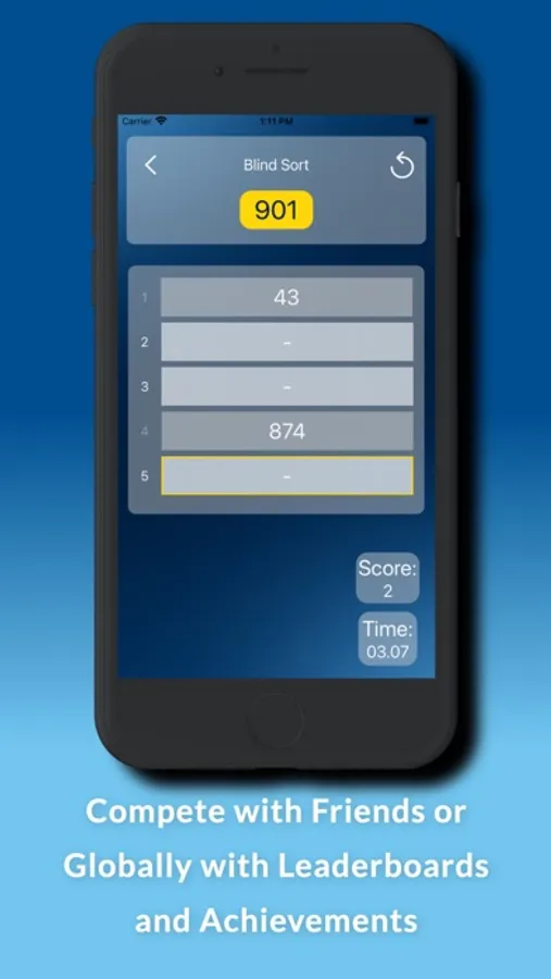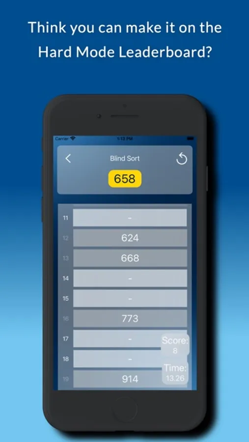 Blind Sort is an innovative puzzle game that requires logical thinking and sharpens your numeric sorting skills. With Game Center connectivity, challenge your friends or the world on leaderboards of all-time wins and fastest game won! Also no ads, we focus on providing a clean gameplay that we all can appreciate. Challenge yourself with different game modes - easy, medium, or hard, and sort numbers based on limited visibility. Enjoy the thrill as the game gets tougher with every move, making each victory even sweeter!