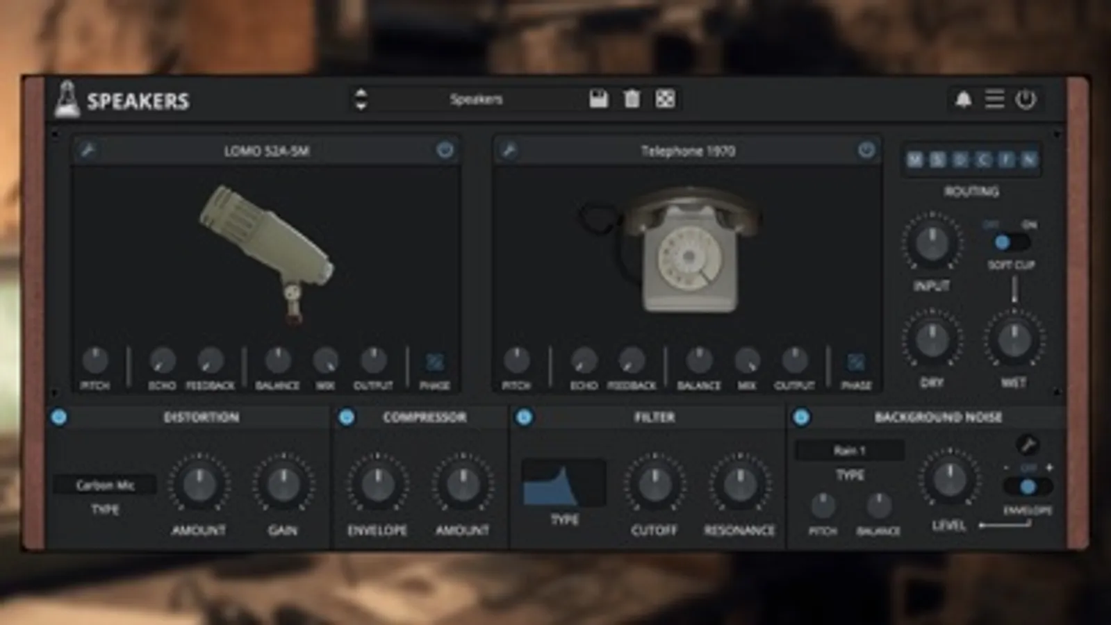 Speakers features a freely configurable effects chain, comprising compression, distortion, and filtering, as well as an array of looping background noises for setting the sound in a variety of environments. Available as AUv3 and Standalone.