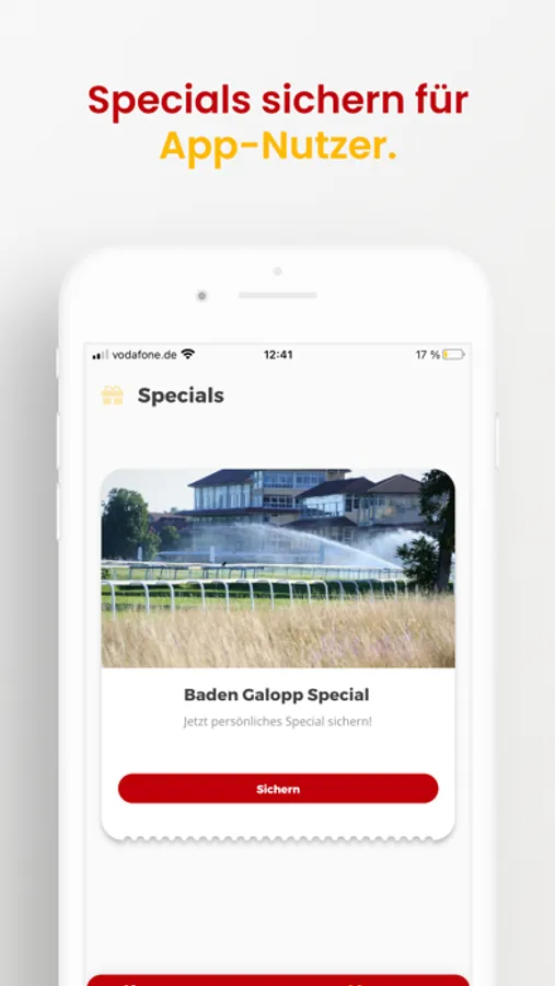 Die Baden Galopp App ist Ihr digitaler Begleiter durch die Renntage auf Deutschlands schönster und wichtigster Galopprennbahn. Sie bietet zahlreiche Möglichkeiten, um Ihren Rennbahnbesuch abzurunden. Sie können darüber Tickets buchen und alle wichtigen Informationen wie zum Beispiel Starterlisten, Quoten und Formen abrufen. Sie finden außerdem alles zum Rahmenprogramm der Renntage, zur Gastronomie und zum Kinderland. Zahlreiche Sonderaktionen und Vergünstigungen warten exklusiv auf Sie als Appnutzer. Mit der Baden Galopp App öffnet sich die digitale Welt für die Rennbahnbesucher und sorgt so für unvergleichliche Momente.