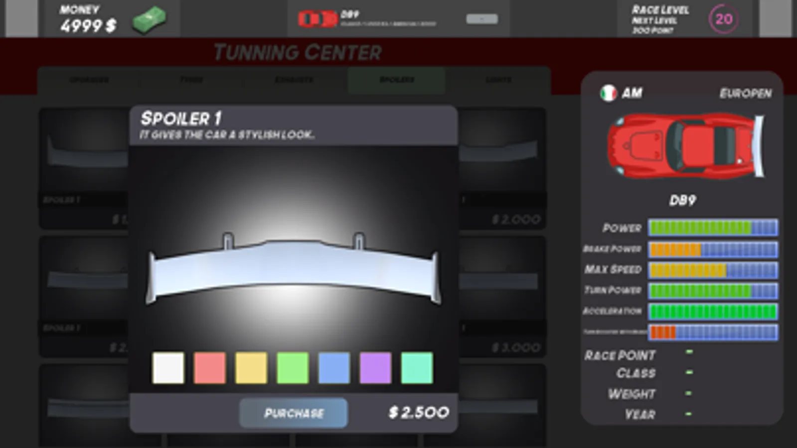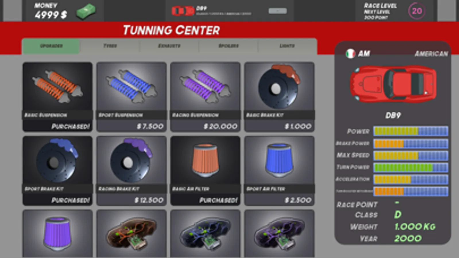 You can increase the power of the car you purchased. You can increase and change many features of the car such as taking off speed, braking power, maximum speed, turning power. If you want, you can attach personalized parts to your car such as exhaust, wings and lighting.