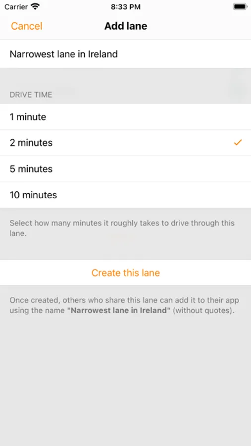 - Add a lane you use into the app, give it a name and set the time it takes to drive through.