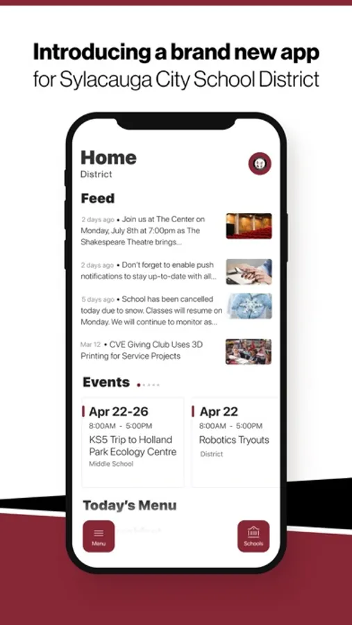 The event section shows a list of events throughout the district. Users can add an event to their calendar to share the event with friends and family with one tap.