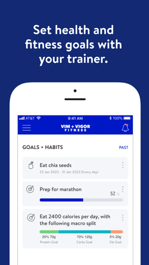 With the Vim and Vigor App, you can start tracking your workouts and meals, measuring results, and achieving your fitness goals, all with the help of your personal trainer.