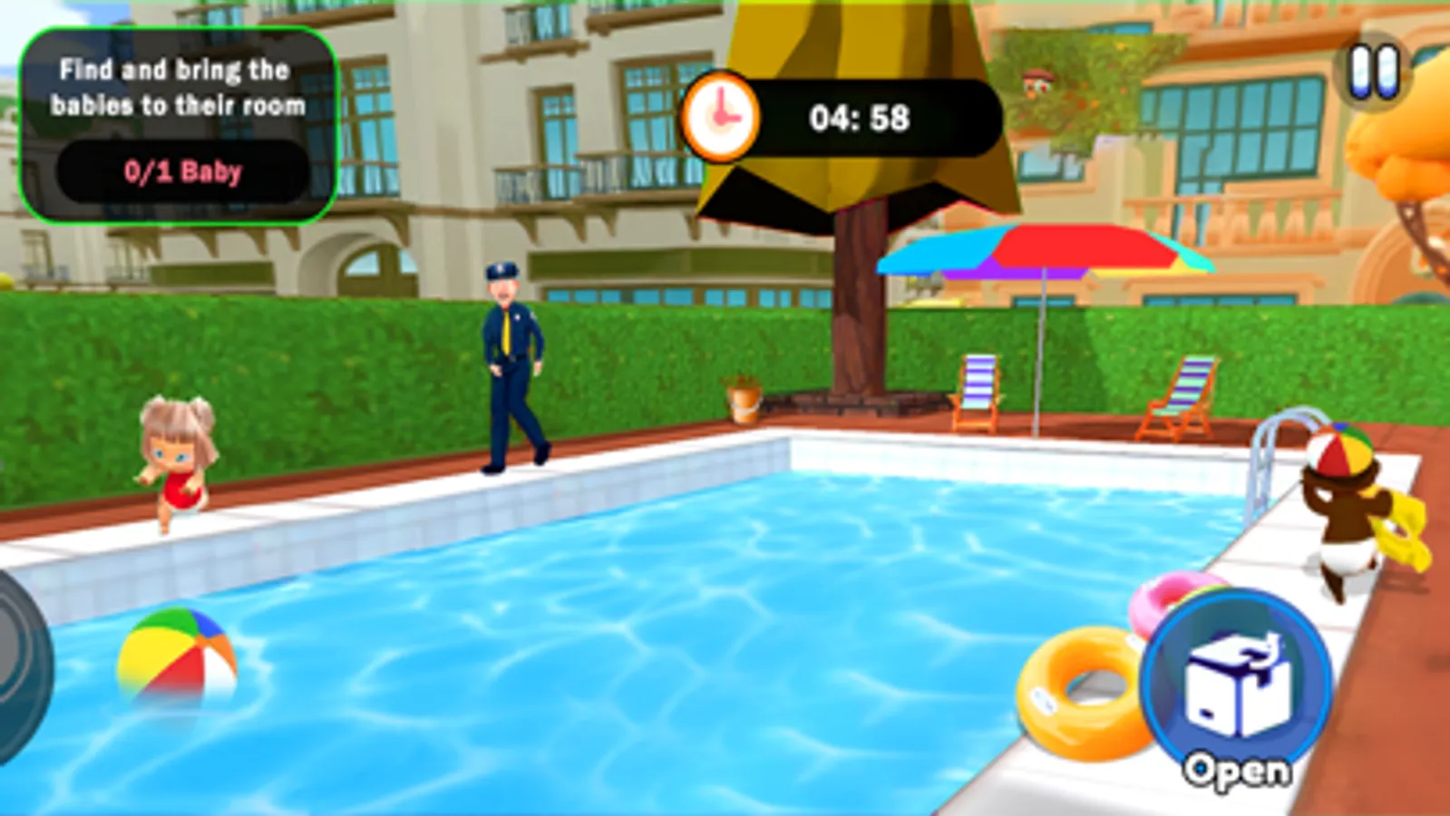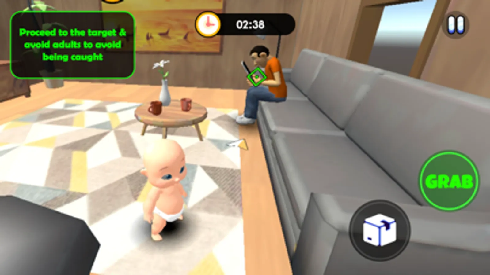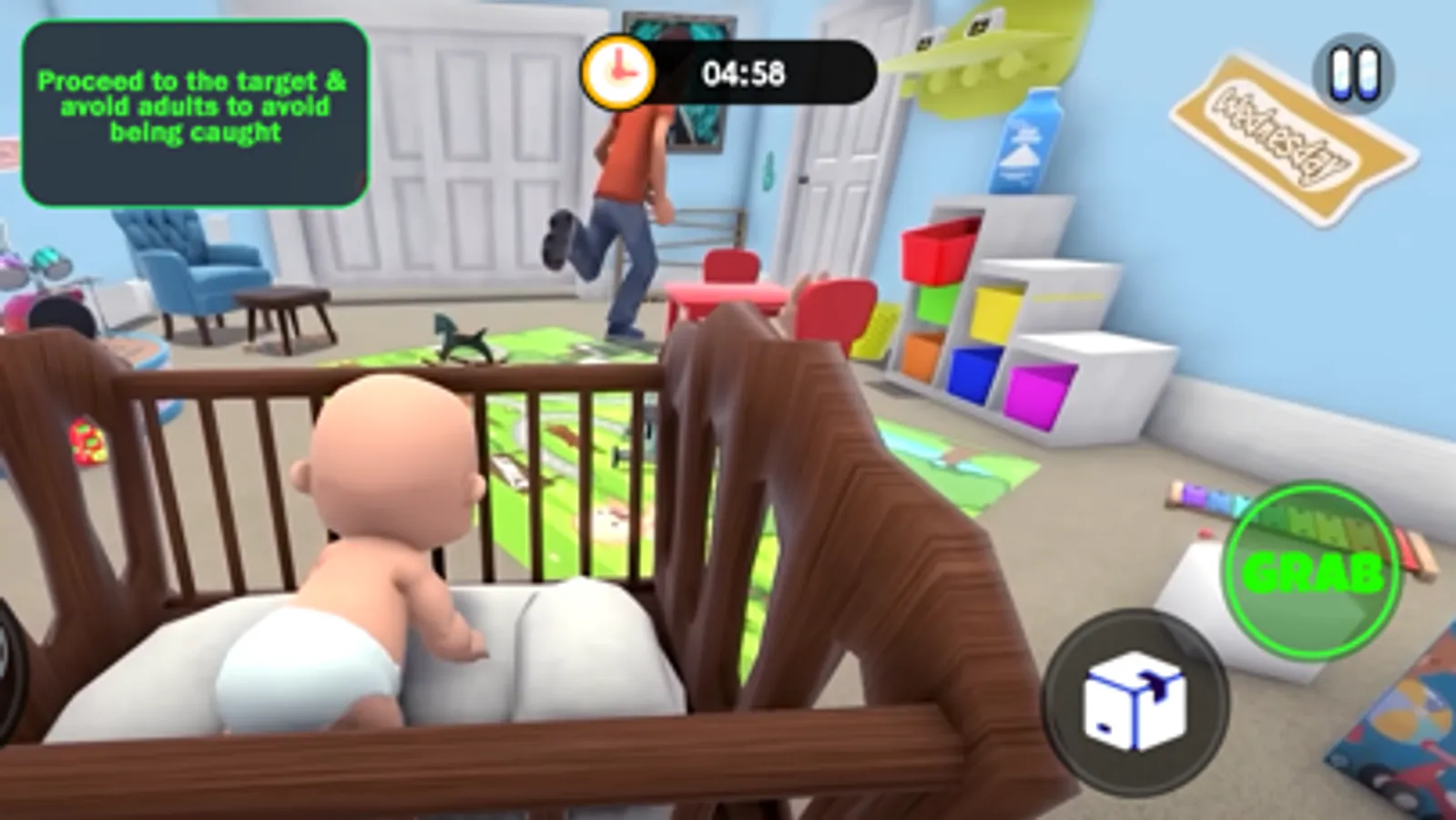 - Move the baby with the joystick and avoid the parents to avoid being caught