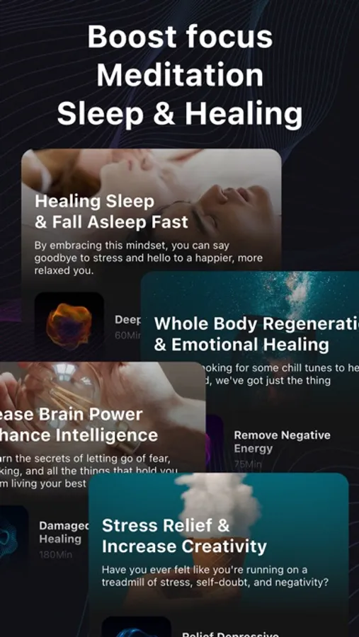 Our binaural beats are designed to stimulate your brain's natural frequency and promote positive changes in your mood, energy levels, and cognitive function. Our tracks range from Relaxation, Concentration, to Sleep, each with carefully selected frequencies that cater to your specific needs. We also offer a range of ambient music that includes Nature, piano and other soothing sounds, to further enhance your relaxation and sleep experience. Selected programs for Focus,Relaxation, Sleep, Meditation, Anxiety, Depression, Stress Relief, Positive Mind, Confidence, Memory, Healing, Brain Function, and much more!