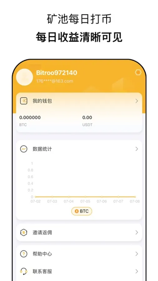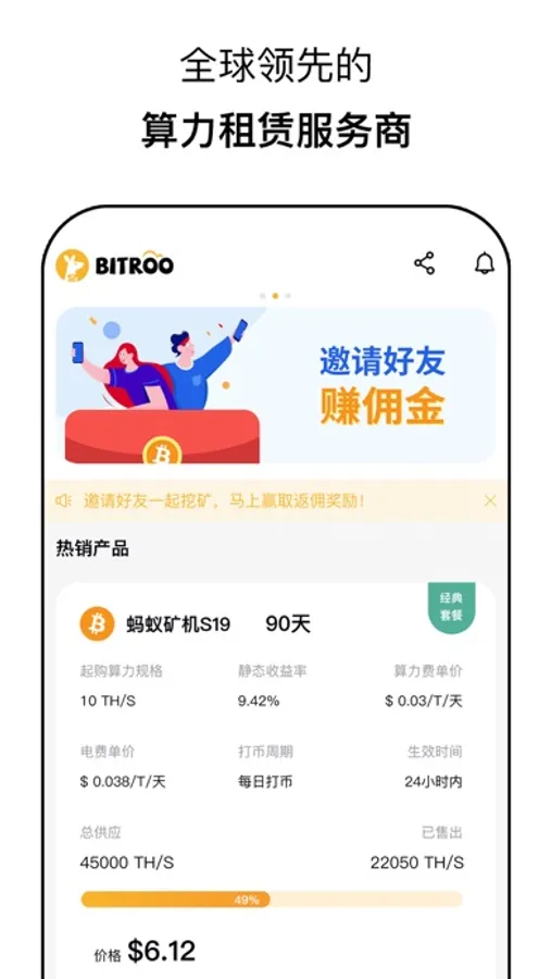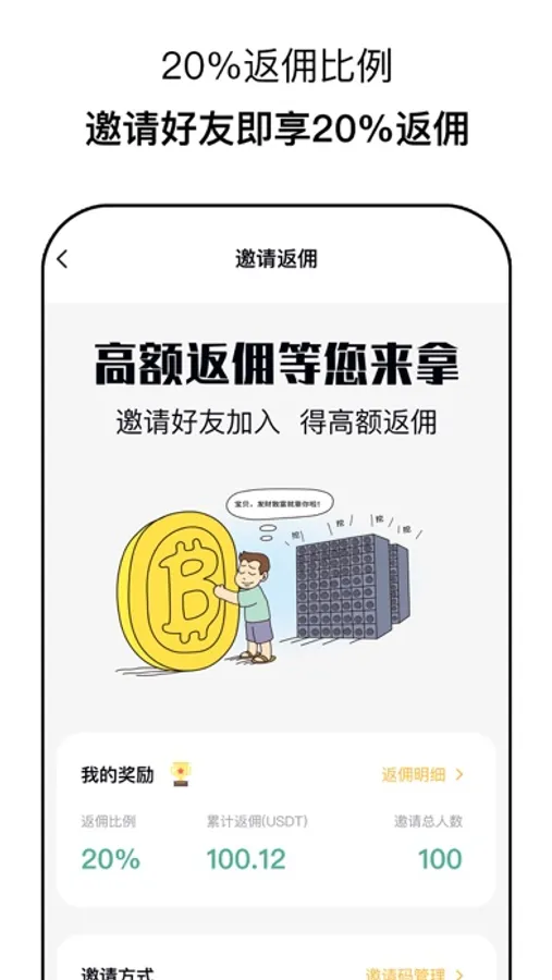 邀请好友超高返佣比例,无论好友购买算力租赁,还是购买矿机托管一站式服务,均可享有佣金返还,佣金每日结算,在这里不只是挖矿,还能赚钱!