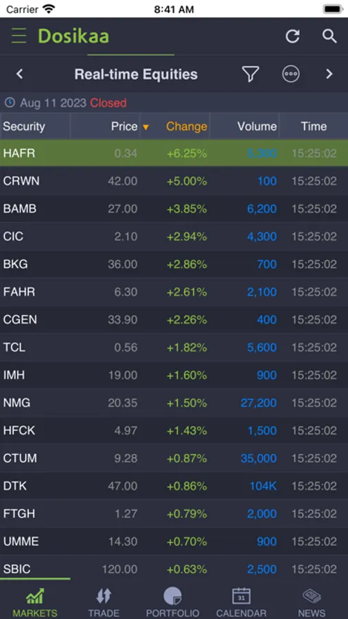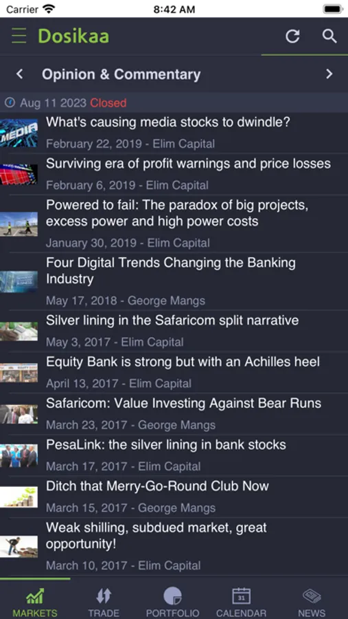 Dosikaa allows you to trade securities listed at the Nairobi Securities Exchange and keep track of your investment with world-class portfolio tracking tools. Get instant access to comprehensive market data, historical data, and company financials spanning over 16 years. Get ahead of the crowd with market-moving business news headlines from Kenya's most trusted sources.