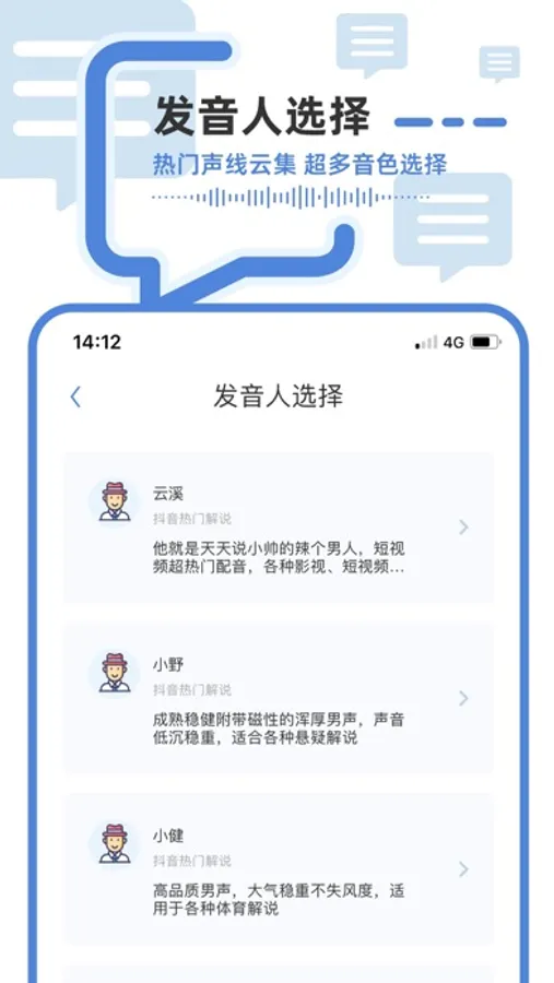 其中包含热门主播云溪,他就是天天说小帅的那个男人,各种影视、短视频解说都离不开他的配音。其中还包括声音低沉磁性的小野,体育解说的小健.......等待你的发掘哦