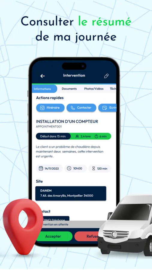 Nomadia Field Service est une application de gestion des interventions conçue pour optimiser la planification des rendez-vous des équipes techniques et améliorer leurs conditions de travail sur le terrain. Réservée aux utilisateurs de la solution de Field Service Management de Nomadia, cette application vise à augmenter le nombre de rendez-vous honorés par jour tout en réduisant le nombre de kilomètres parcourus et en respectant les engagements pris auprès des clients. Véritable assistant tout-en-un, Nomadia Field Service accompagne les techniciens sur le terrain et les aide à réaliser leurs tournées en toute sérénité et sécurité ! La charge de travail est mieux répartie entre les équipes, les délais d’intervention sont respectés et les journées de travail sont mieux organisées, garantissant la réalisation de l’ensemble des interventions sans heures supplémentaires ni retards.