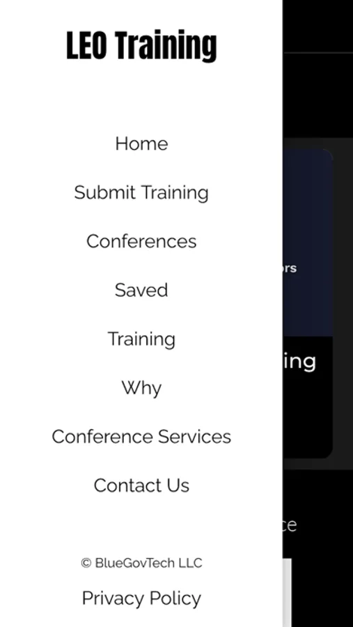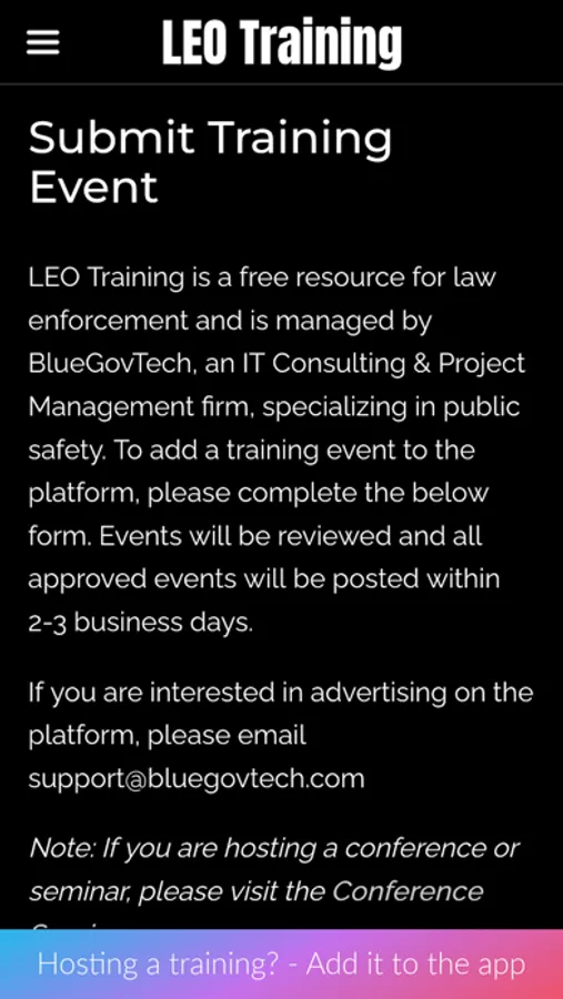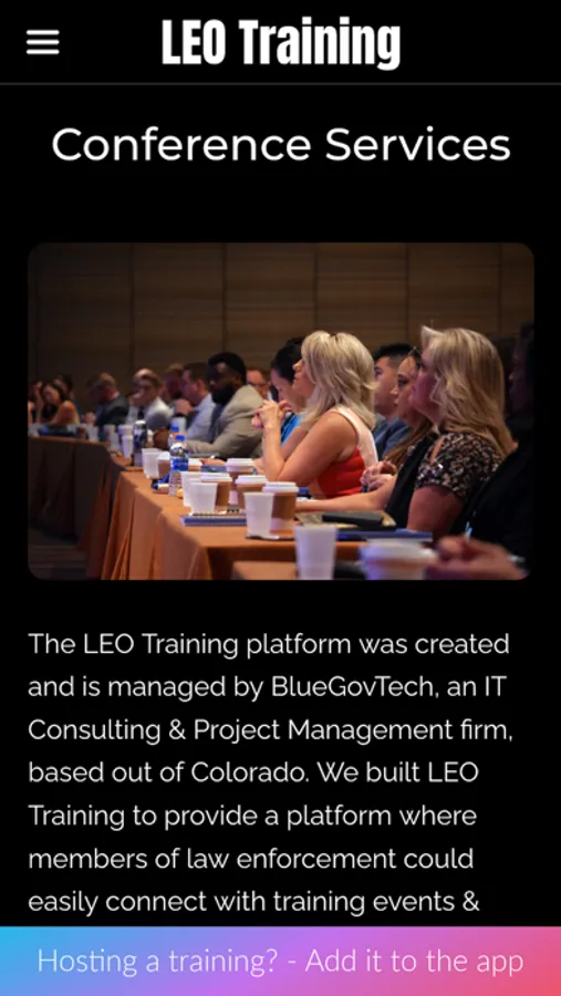 LEO Training is a free mobile app that allows training providers to publish training and members of law enforcement to quickly find training near them, based on training categories. LEO Training was created and is managed by BlueGovTech LLLC, a Colorado based IT Consulting & Project Management firm, specializing in helping public safety agencies.