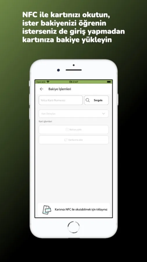 Uygulama Fonksiyonları : Sanal Kart, QR Oku, QR Göster, Bakiye İşlemleri, Abonmanlık İşlemleri, Bakiye Yükleme, Son Yüklemeler ve Harcamalar, İletişim ve Geri Bildirim