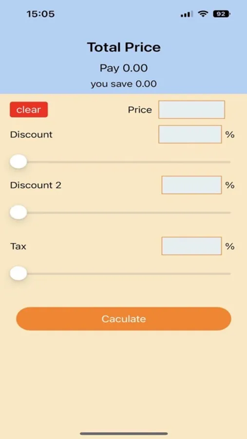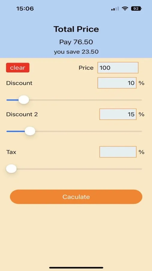A tool app for calculating discounts and taxes, which displays the final paid amount and discounted amount after calculation is completed