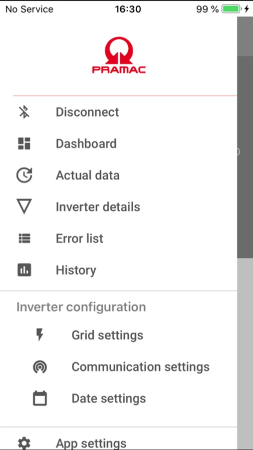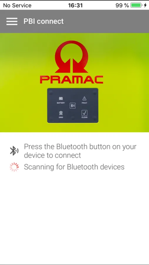 PBI connect is used for the Pramac battery inverters as LCD display replacement, commissioning help and configuration tool. It helps you to do the commissioning of your inverter and visualize device information, actual values and error logs in an easy way, through a Bluetooth interface which communicates with your smartphone.
