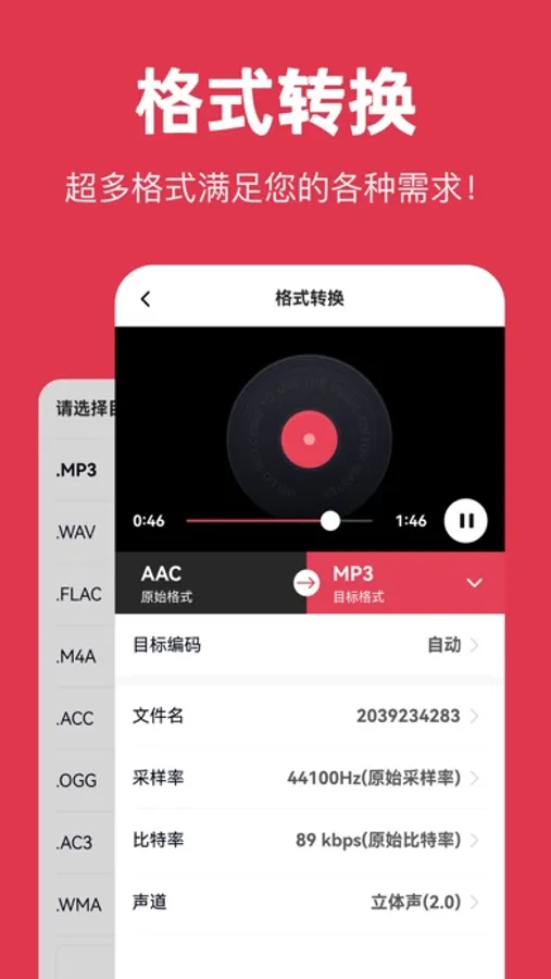 3.格式转换:支持mp3、m4a、aac、wav、awb、aiff等多种音频格式转换,自由设置音频比特率、采样率、淡入淡出时间