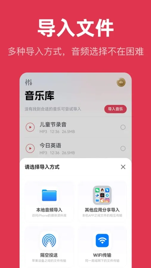 9.支持更多的导入音频方式:文件导入支持本地音频库和相册导入、从其他应用导入、隔空投送、 WIFI传输四大方式,选择需要剪辑的音频更方便