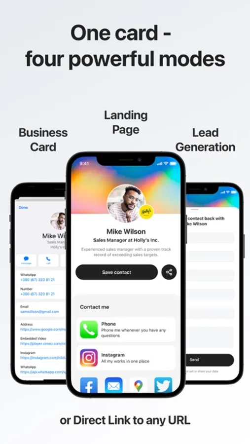With LBC, you have complete control over your digital business cards. Our user-friendly app allows you to modify your information effortlessly and choose from a range of modes that best suit your needs. Whether you prefer a dynamic landing page, a traditional business card layout, a direct link to a specific URL or a lead generation form, LBC has you covered.