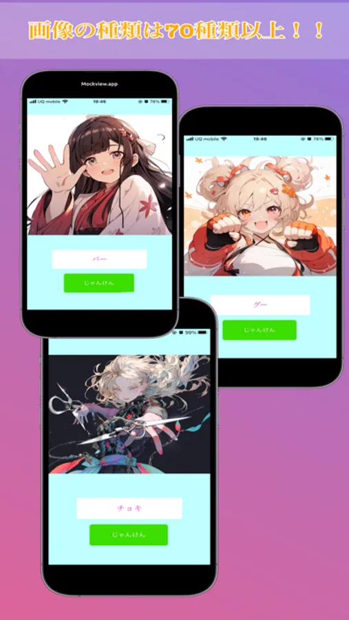 自動作画サービス・Midjournyを使用して70種類以上のイラストを作成しました。じゃんけんアプリとしては簡単な構成になっています。合間時間などに是非プレイしてください。