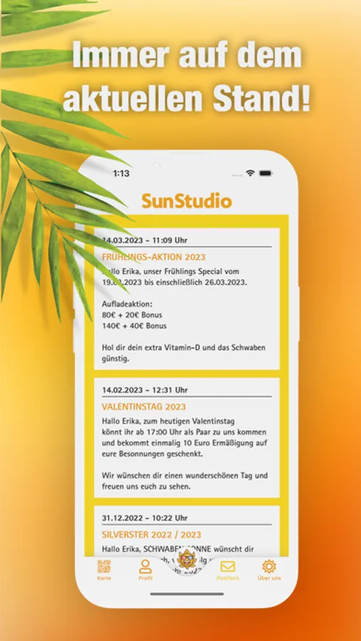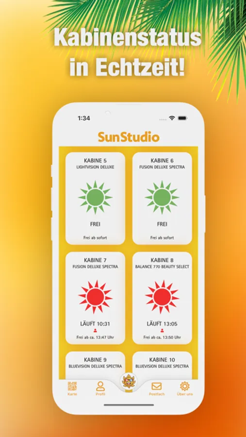 Die App bietet dir neben aktuellen Angeboten, Öffnungszeiten, Aktionen und Informationen, auch den augenblicklichen Kabinenstatus in Echtzeit, von deinem Sonnenstudio. Somit weißt du immer, ob, oder wie lange, deine Lieblings-Sonnenbank noch läuft.