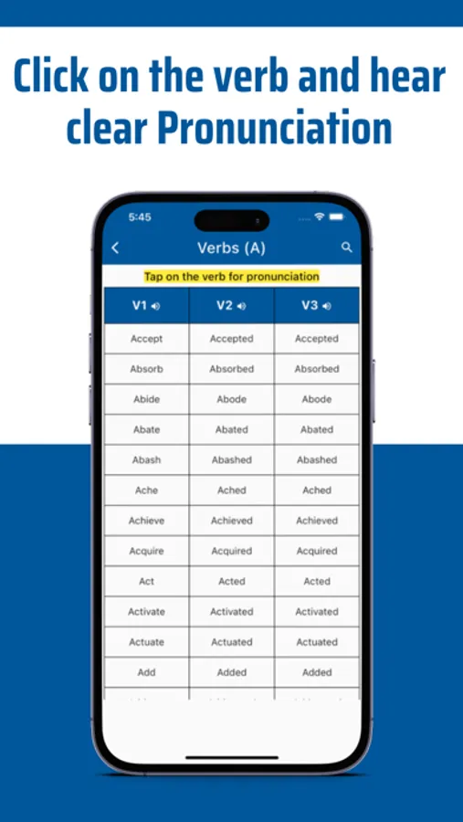English Verbs - V1 V2 V3 is an exceptional mobile application specifically designed to assist English language learners in mastering verb conjugations. English Verbs - V1 V2 V3 is a great way to learn the three main verb forms in English. With its vast database of 1300+ verbs, including regular and irregular verbs, this app provides a comprehensive resource to improve grammar, vocabulary, and overall English proficiency. Whether you are a beginner or an advanced learner, this user-friendly app offers a plethora of features to support your language journey.