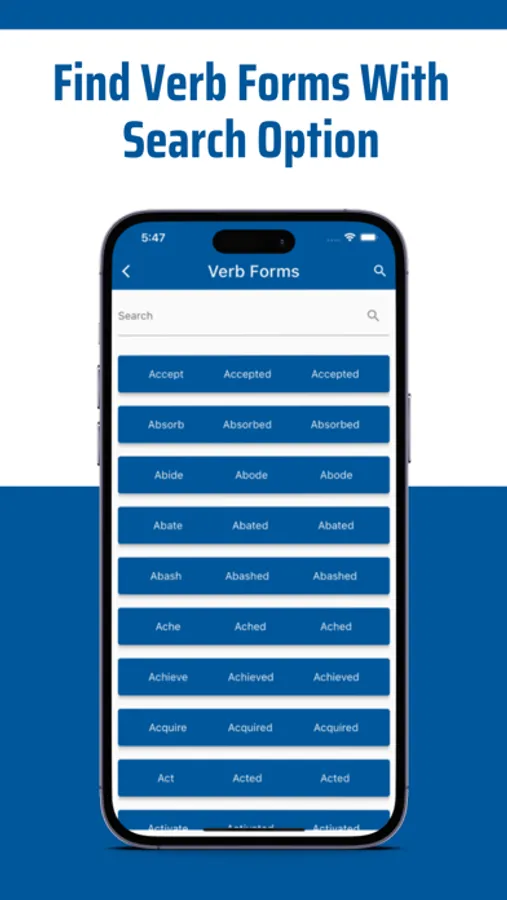 English Verbs - V1 V2 V3 offers a powerful search feature that allows users to quickly find specific verbs from the extensive database. Whether you need to conjugate a particular verb or explore a list of verbs belonging to a specific category, the app's search functionality provides instant results. This saves time and allows learners to focus on specific verbs or verb patterns they wish to study.
