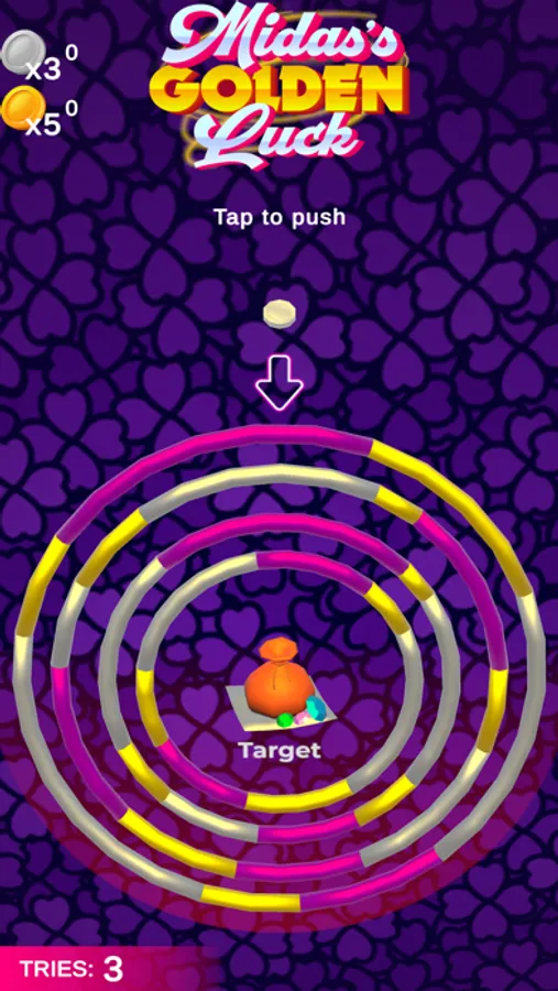 However, there's a twist! Surrounding the bag target, you'll discover four circles that are constantly rotating. Each circle represents a distinct zone with its own unique properties. The golden area, where shooting your coin through it will magically transform it into a valuable golden coin which multiplies the number of points by 5. The silver area, which will turn your coin into a dazzling silver one which multiplies the number of points by 3. But beware of the pink dead zone. If your coin passes through this treacherous area, you'll lose a life. Take aim meticulously and time your shots perfectly to maximize your score and avoid losing lives.