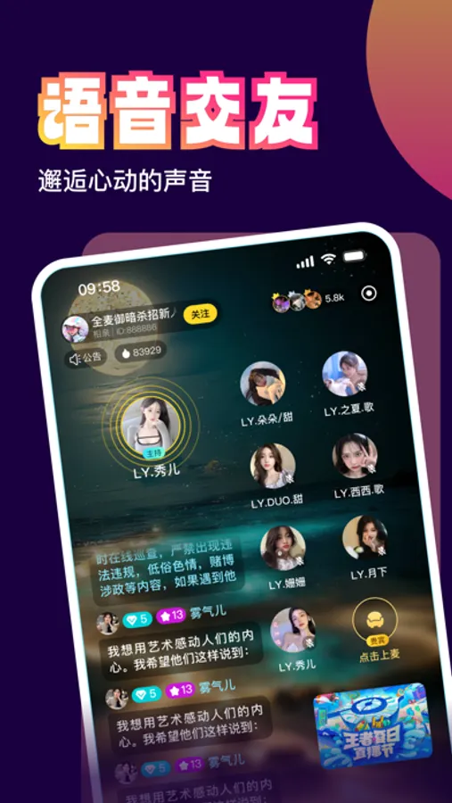 处CP、ktv、点唱等房间玩法丰富多样,上麦聊天、小游戏互动快速破冰,还有炫酷礼物;