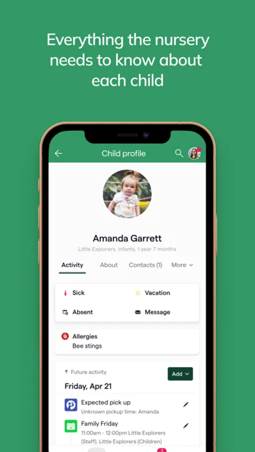 3. Messaging and Communication: The app facilitates direct and secure messaging between parents and the school. This allows parents to easily communicate with the school, ask questions, provide instructions, or discuss any concerns related to their child's care.