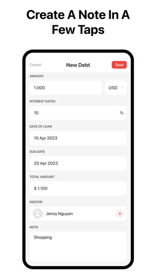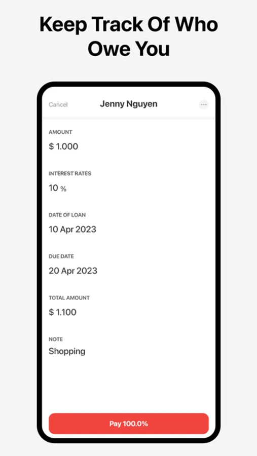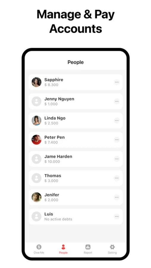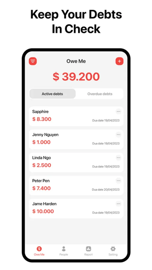 - People: Users can manage the debtor's contact list and the total amount that the debtor owes. In addition, you can go to the debt details and view the debt payment history of the debtor