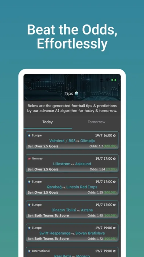 Discover the art of smart betting. Unleash the potential of artificial intelligence in transforming your sports betting strategies. Say goodbye to uncertainty, and let our mobile app guide you towards insightful, AI-generated football betting tips. You're one tap away from revolutionizing your betting experience.