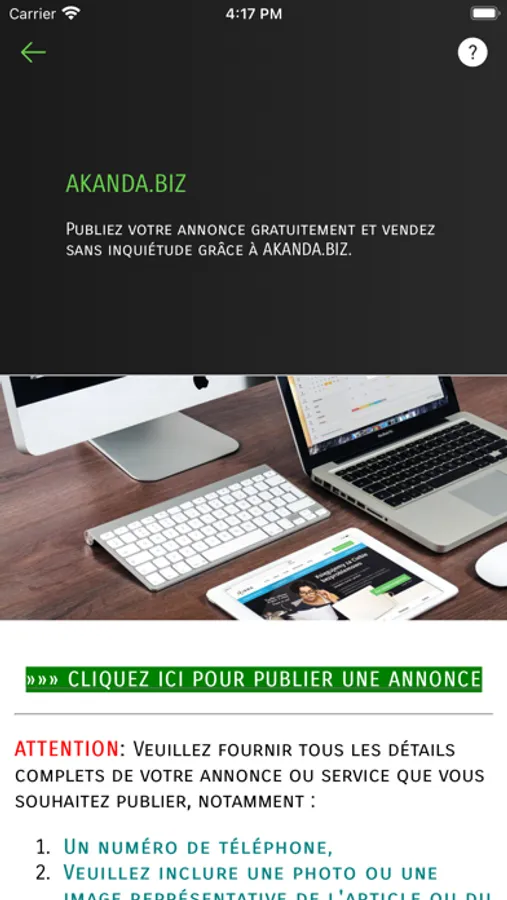 Que vous soyez un entrepreneur indépendant cherchant à promouvoir vos services, une petite entreprise souhaitant atteindre de nouveaux clients, ou un citoyen voulant vendre des objets inutilisés chez vous, AKANDA.BIZ vous offre une plateforme conviviale et efficace pour atteindre vos objectifs. Vous pouvez créer et publier des annonces en quelques clics, avec des descriptions détaillées et des images attractives pour attirer l'attention des acheteurs potentiels.