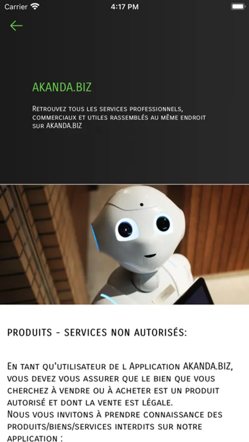 L'application AKANDA.BIZ offre une plateforme facile à utiliser pour promouvoir les services de toutes les entreprises, qu'elles soient petites ou grandes, ainsi que pour les Freelances, PME, PMI, vendeurs particuliers et même les citoyens qui souhaitent vendre des objets inutilisés chez eux. Grâce à AKANDA.BIZ, vous pouvez acheter, vendre et consulter des annonces en ligne, tout en faisant connaître vos offres à une large audience. Rejoignez la communauté AKANDA.BIZ et découvrez de nouvelles opportunités pour votre activité au Gabon !