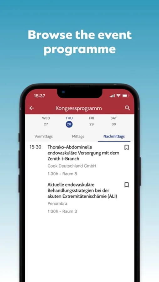 Bereiten Sie Ihre Kongressteilnahme ganz einfach mithilfe der App vor, nutzen Sie sie zur Orientierung vor Ort und finden Sie alle relevanten Informationen rund um das Programm, die Referent*innen und die parallel stattfindende Industrieausstellung kompakt auf Ihrem Smartphone.