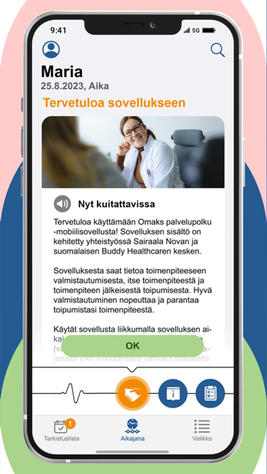 Omaks palvelupolku -sovellus tarjoaa käyttäjälleen kaiken tiedon hoitoon liittyen helposti ymmärrettävässä muodossa. Aikajanalta potilas voi nähdä hoitoonsa liittyviä tapahtumia ja tehtäviä ja kuitata ne suoritetuiksi.