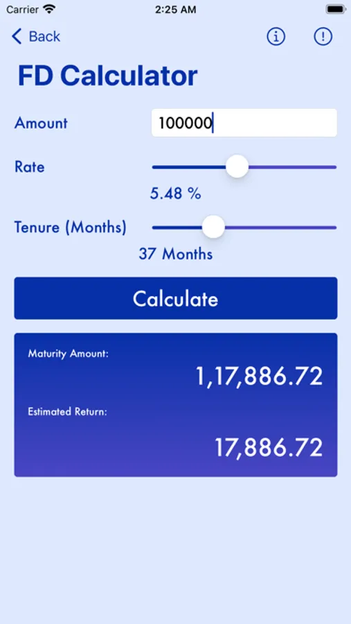 2. FD Calculator: Calculate the interest earnings and maturity values for fixed deposit investments. Input the principal amount, interest rate, and tenure to determine the returns on your fixed deposits.