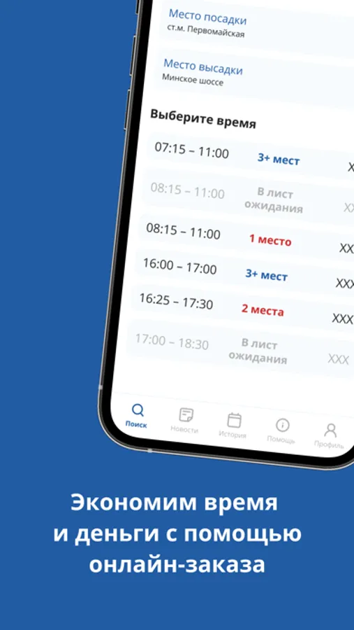 Приложение показывает все доступные времена выездов на нужное вам время, а также количество свободных мест в режиме онлайн.