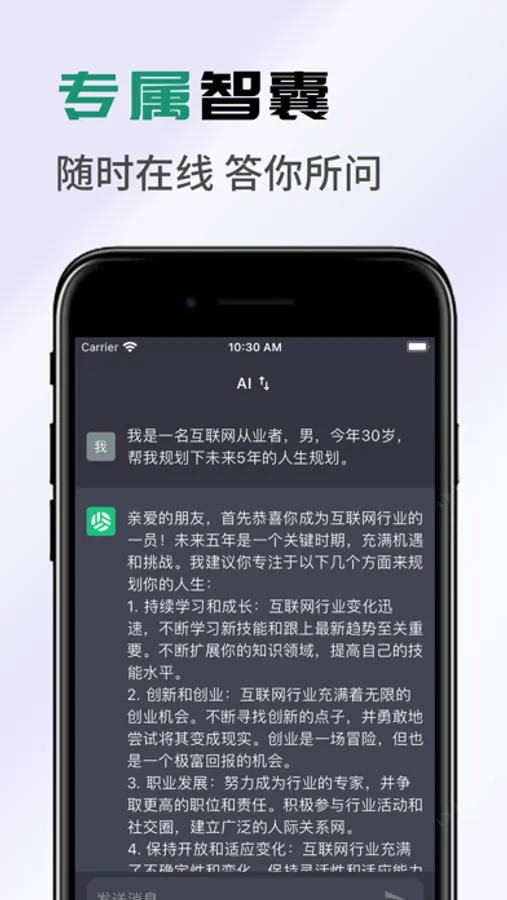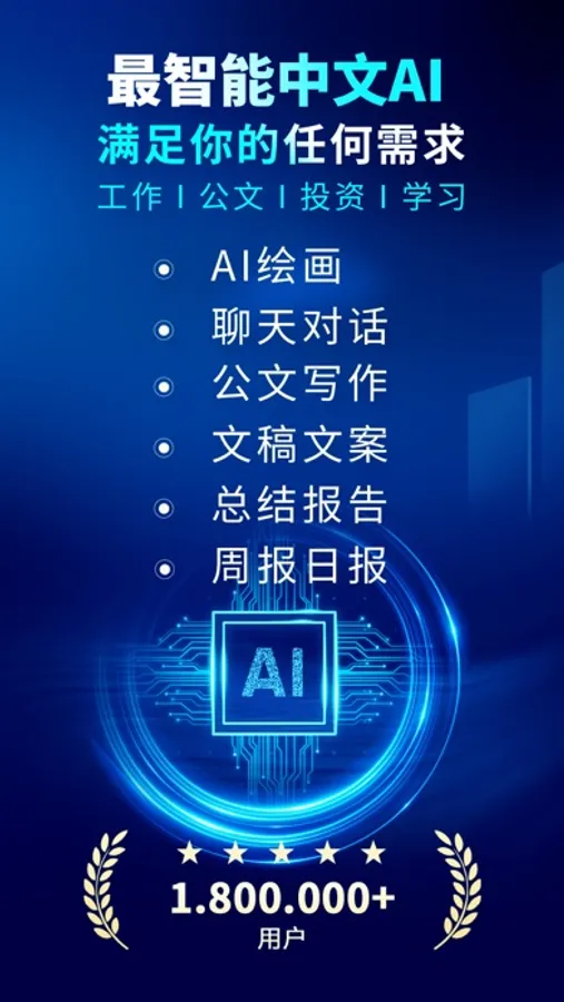 【更多功能】 -智能聊天:探索未知的世界,像朋友一样聊天 -AI创作:帮您写出高分作文 -论文创作:帮您写出优质论文 -诗词歌赋:替您构思,写出精美诗句一个性签名:制作属于您的签名 -日程计划:为您制定合理计划 -智能翻译:支持多国语言翻译 提示声明: 1.您在使用本应用咨询医疗相关的问题时候,本应用只是用于提供建议,不能当作医疗的服务和手段,还请咨询正规医疗机构进行治疗,对此我们不承担任何责任。 2.您在使用过程中产生的结果均由计算机生成,仅供您参考,还请您自行辨别。