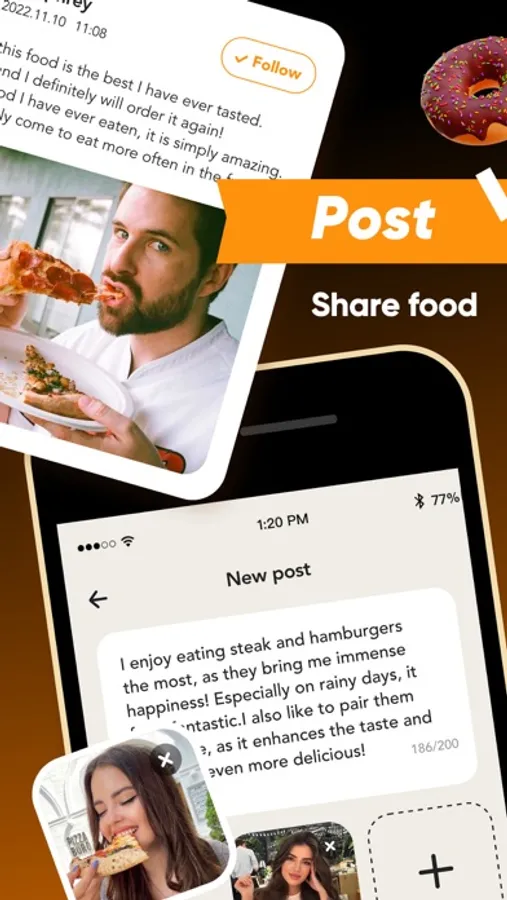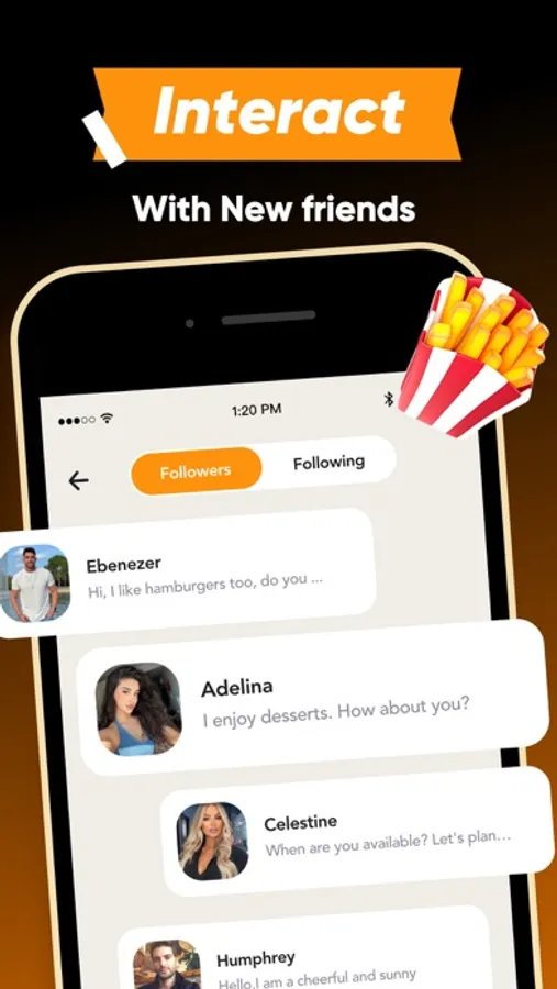 Authentic connection-Explore connection with a text feature and push notifications that prompt response. Start off at happy hour, enjoy the here and now, and find people you resonate with on an intimate food level.