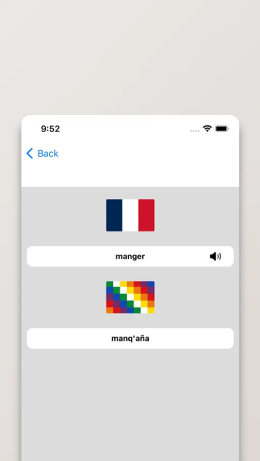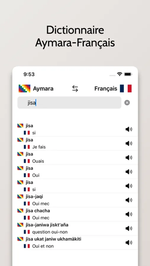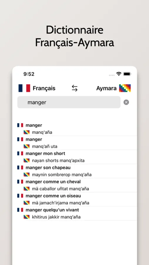 - Possibilité de rechercher à partir de mots en Français ou en Aymara