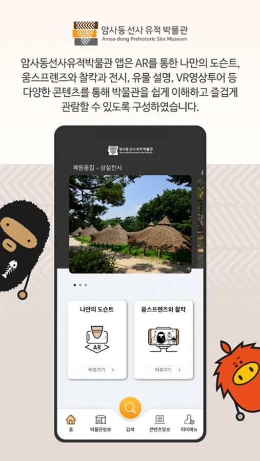 - 빗토가 설명해주는 나만의 도슨트 투어를 통해 실감나는 유물 AR, 이미지와 영상을 통해 암사동에서 살던 선사시대의 선사인의 생활사를 쉽게 이해하고 퀴즈를 풀며 움스프렌즈 카드도 모아보아요! 움스 프렌즈와 함께하는 암사동 선사 유적 박물관을 쉽고 재밌게 이해할 수 있어요.