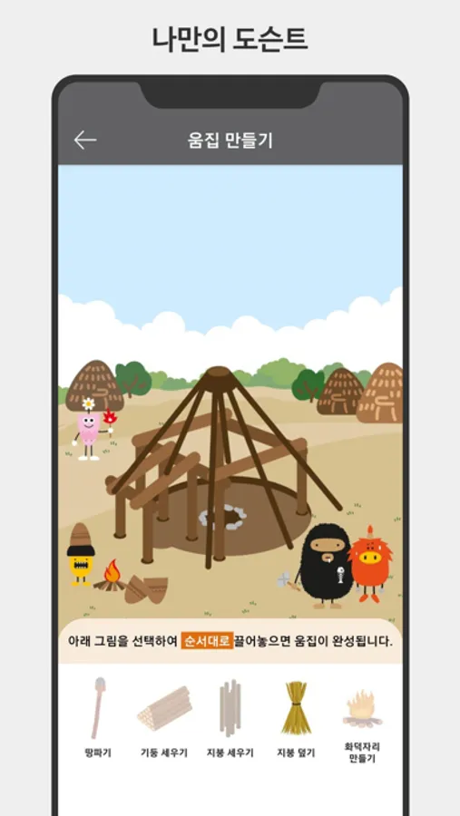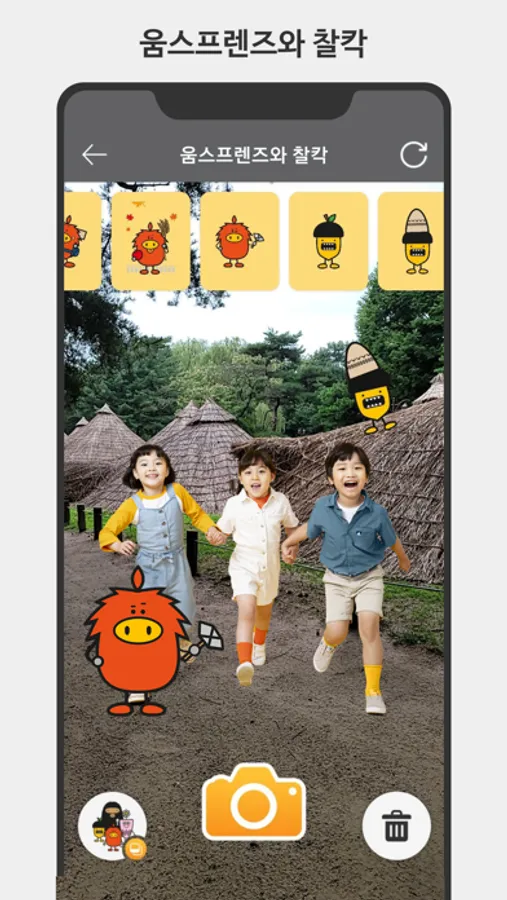 - 나만의 도슨트를 듣고 움스프렌즈 카드를 모으면 움이, 빗토, 토리, 코기와 함께 사진을 찍을 수 있어요! 멋진 움집을 배경으로 움스 프렌즈와 찰칵!
