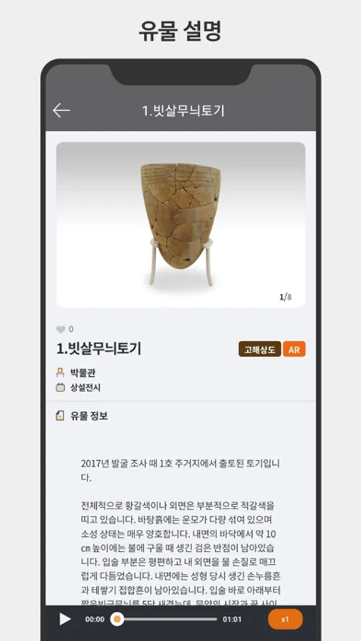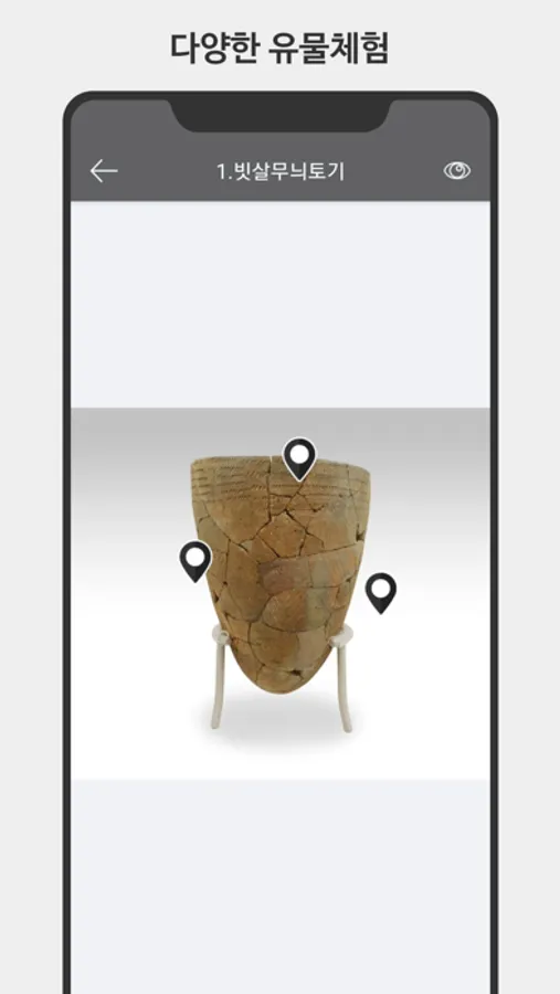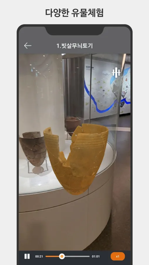 - 유물 설명을 통해 자세한 정보를 얻을 수 있으며, 3D 스캔한 유물을 AR 콘텐츠로 더욱 실감나게 즐길 수 있어요.