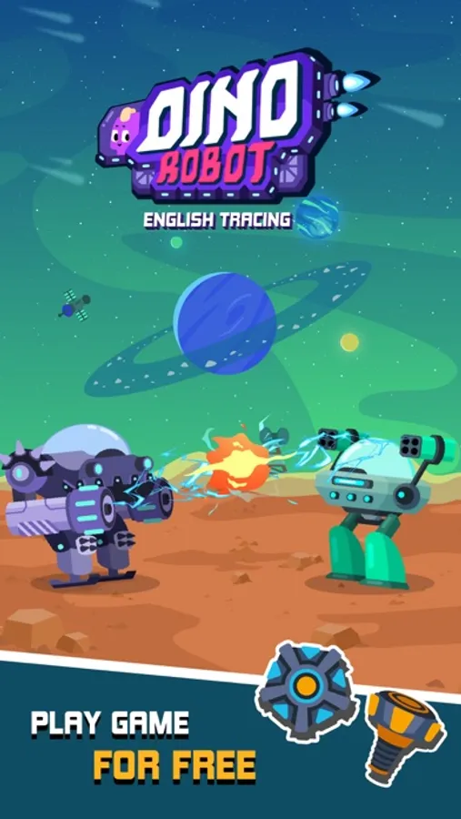 Dino Robot - English tracing is a free game that teaches English in a fun and exciting way. You can build your own robot and fight with enemies on different planets with the instruction of DINO - our fun dinosaur character while tracing words correctly and learning new vocabulary. You can choose from different types of robots and customize them with guns and stickers. You can also collect treasure to upgrade your robot and unlock new planets such as Pizza Planet, Cookies Planet, and Sushi Planet.