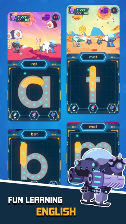 - Face enemy robots and dragon battles that will challenge your tracing skills and your English knowledge.