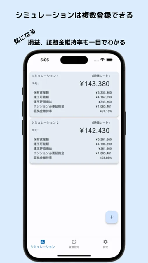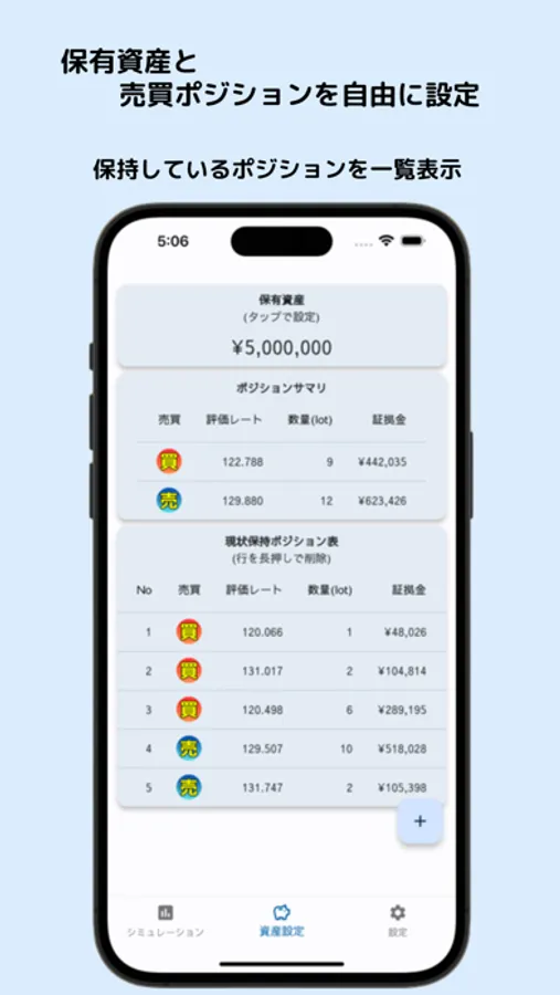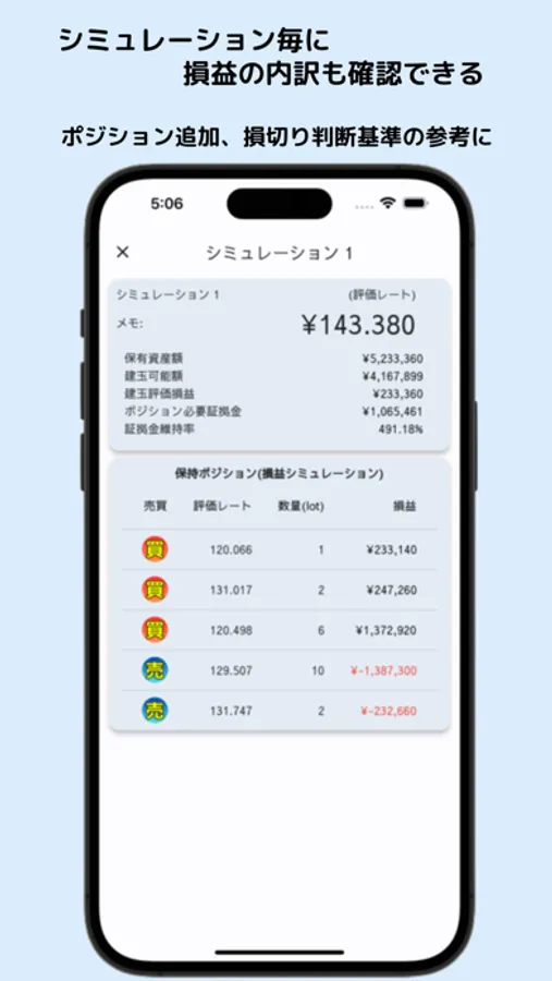 保有資産と売買ポジションを設定し、到達レートを仮置きすることで容易に到達レートごとの計算結果を得ることができます。