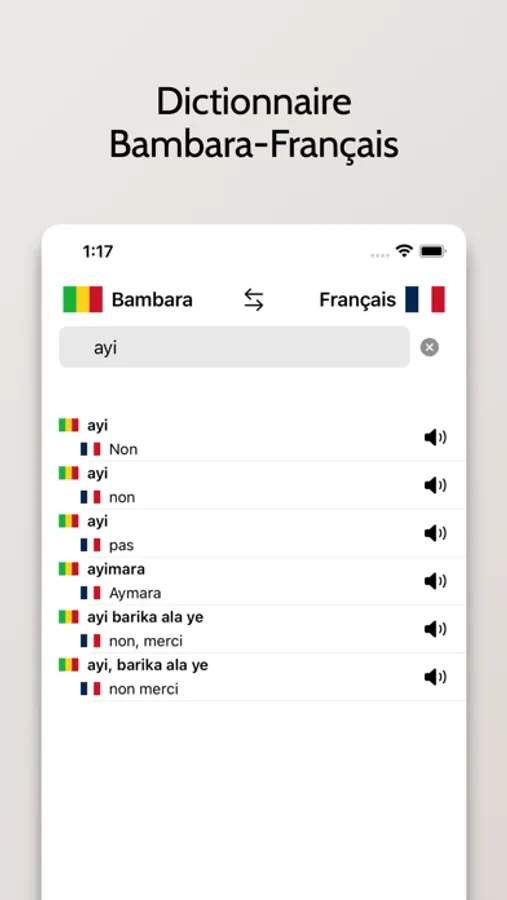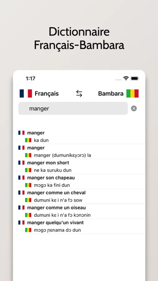 - Possibilité de rechercher à partir de mots en Français ou en Bambara
