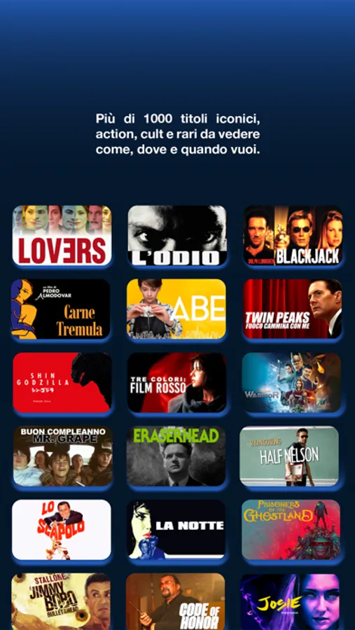 The Film Club is a multi-channel streaming platform, reserved for over 18 on Italian territory, which provides an exclusive catalog of TV series and auteur, genre, classic, cult, action and rare films, to be watched without commercial breaks, whenever and wherever you want. Over 1000 titles from every genre and era, from masterpieces of film history to cult B-Movies, and a free cinema ticket every month included with the Premium offer!