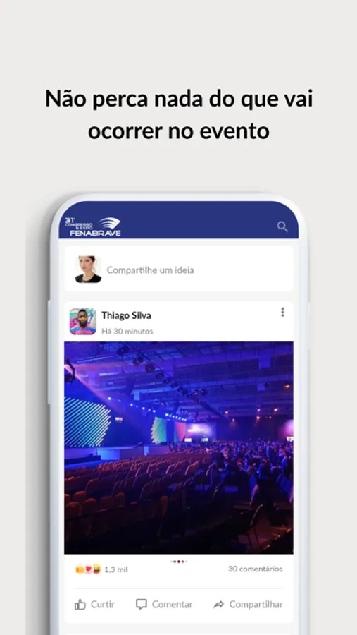 Com o aplicativo “Congresso ExpoFenabrave 2023”, você tem acesso a uma rede social exclusiva, pode fazer novos contatos, enviar perguntas aos palestrantes, trocar mensagens com outros participantes, enfim, interagir com a comunidade. Além disso, você pode consultar a programação, avaliar conteúdos, dar feedback e responder quizzes. Utilize o APP e aproveite ao máximo os recursos.