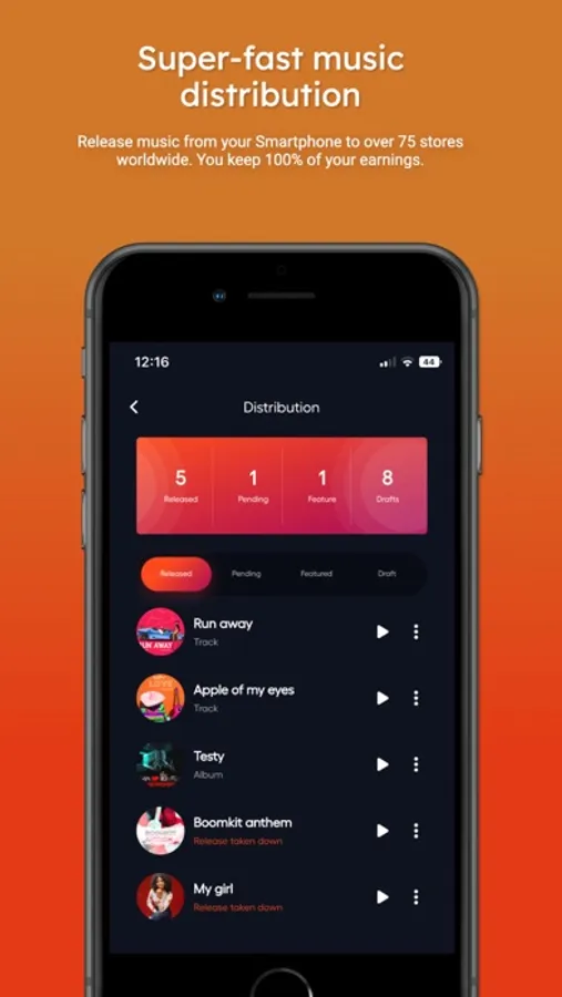 Get your song on Apple Music, Spotify, TikTok, Boomplay, and over 150 digital stores. Split royalties with your collaborators and get paid directly into your local bank account.